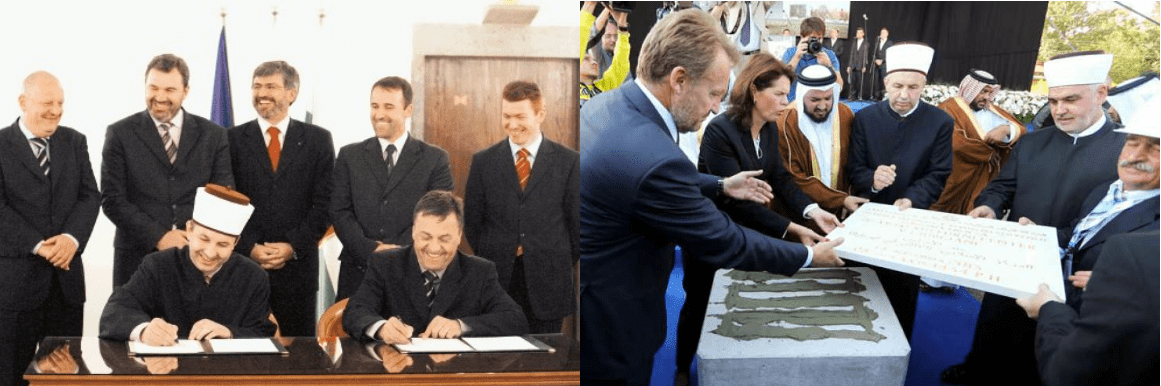Podpis gradnje džamije (Zoran Jankovič) in polaganje temeljnega kamna (Alenka Bratušek) v Ljubljani, ki bo zgrajena s pomočjo Katarja, enega bolj znanih financerjev islamskega terorizma