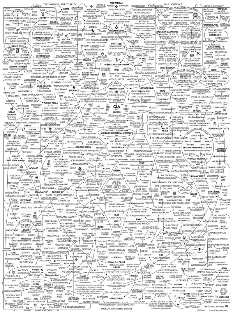 Jedro gibanja se naslanja na dokumentarec ’PAD KABALE’, ki ga je ustvarila Nizozemka Janet Ossebaard. Na začetku nas pozove, naj ničesar ne vzamemo kot kot resnico, kar je seveda bistveno pri vsaki stvari. Vsa informacija naj bi bila tehnično obravnavana kot ’teorija,’ ki vas spodbuja, da raziskujete točke te mreže in pridete do lastnih zaključkov glede njene veljavnosti. Prav zaradi tega Q naj ne bi bil KULT. A kot je videti, večina pripadnikov gibanja Q, ni naredila domače naloge in spregledala to domiselno manipulacijo, ki uporablja pristop, kjer v 99% RESNIČNIH INFORMACIJ SKRIJETE 1% LAŽI. Tukaj je potrebno povedati, da je informacij za raziskavo zares ogromno. Dylan Louis Monroe je ustvaril miselno karto, ki vsebuje resnično zgodovino človeštva in struktur moči. Osredotoča se na kronološko časovnico naše prikrite zgodovine, poudarja vladne projekte in operacije, okultna prepričanja svetovni kontrolorjev, razkrite tajne informacije, laži s strani medijev in stvari, ki jih običajno ne boste prebrali iz uradnih zgodovinskih učbenikov. V svojih 20 letih raziskovanja tega področja lahko potrdim, da karta drži. Gre za labirint po katerem lahko potujete vso življenje in mnogim se to tudi zgodi. Naša resnična zgodovina je fascinantna in pot po njej je ODSTRANJEVANJE TEORIJE IZ ‘TEORIJE ZAROT’.